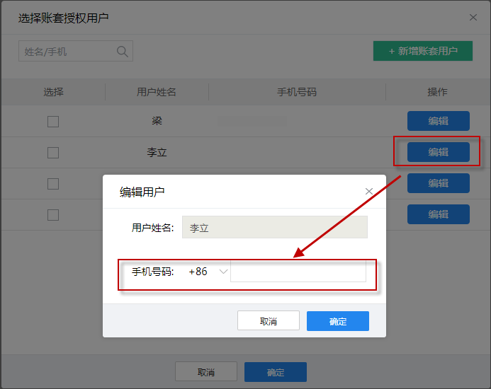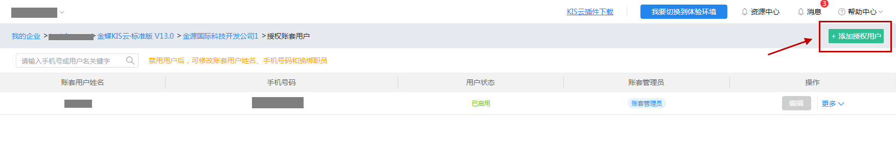 步骤二:进入授权账套用户列表,点击添加授权用户