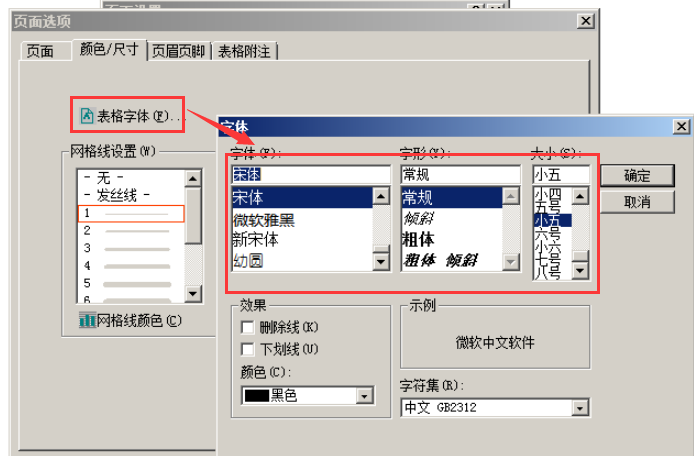 2、单击【页面】,打开【页面设置】页签,单击【表格字体】,然后设置对应的字体信息【确定】即可