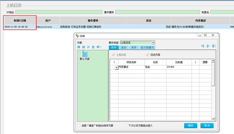 2、过滤条件的窗口,[内容描述] 包含 [单据编号]来进行筛选.