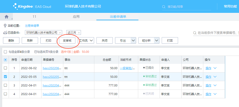 业务/财务领导进行单据审查时,如果发现单据有问题,可以在EAS Cloud网页端/客户端进行反审核操作。