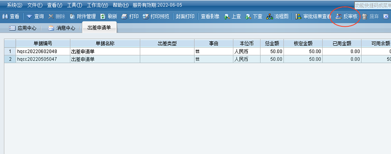 出差申请单反审核时首先检查是否符合反审核的条件,如果符合则反审核成功,如果不符合则给出提示。