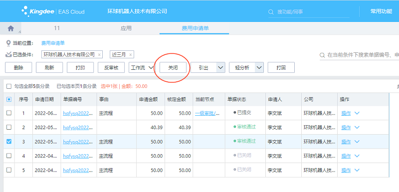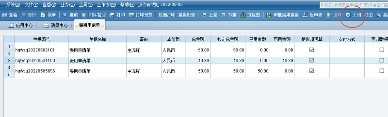 财务在EAS Cloud网页端/客户端费用申请单序时簿选中需要关闭的费用申请单,点【关闭】按钮,费用申请单是否关闭成功会有相应的提示。