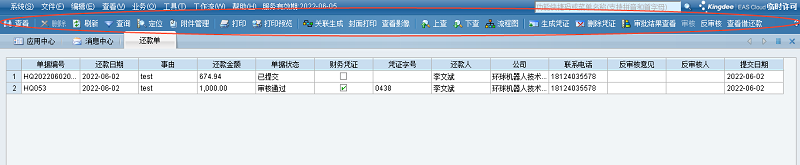 〖财务会计〗->〖费用管理〗->〖费用核算〗->〖还款单〗