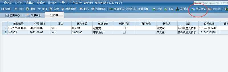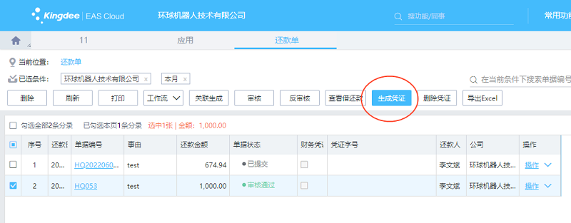 CP002=是、CP034=是、CP008=否:“审核通过”状态的还款单,可以点【生成凭证】按钮生成财务凭证。