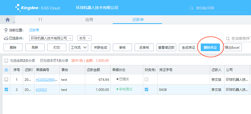 财务在EAS Cloud网页端/客户端还款单序时簿选中需要删除凭证的还款单,点【删除凭证】按钮,系统会直接删除财务凭证。
