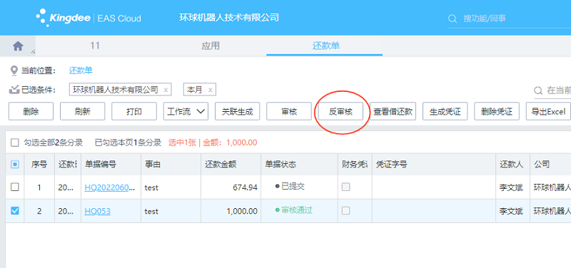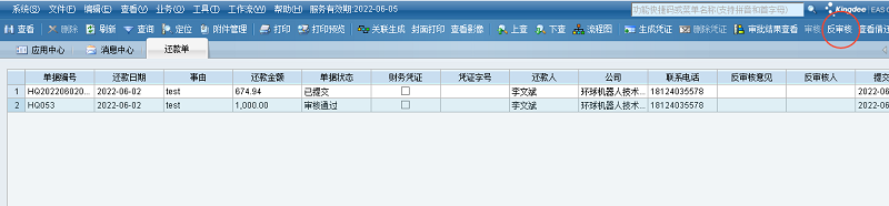 财务在EAS Cloud网页端/客户端还款单序时簿选中需要反审核的还款单,点【反审核】按钮,还款单是否反审核成功会有相应的提示。