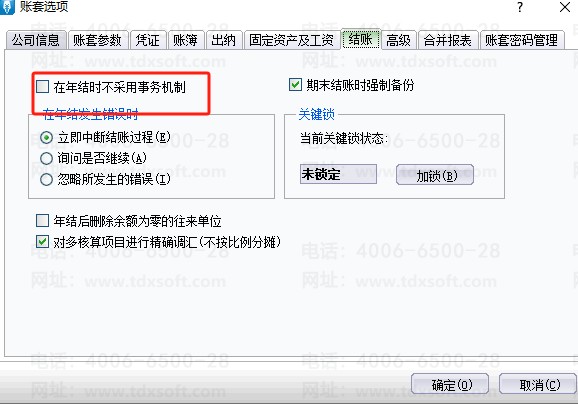 标准迷你版年结报错问题,如图,一般是由于凭证数太多,账套数据量太大导致。此问题建议在[系统维护]-[账套选项]-[结账]中勾选“在年结时不采用事务机制”的参数,再进行结账即可。