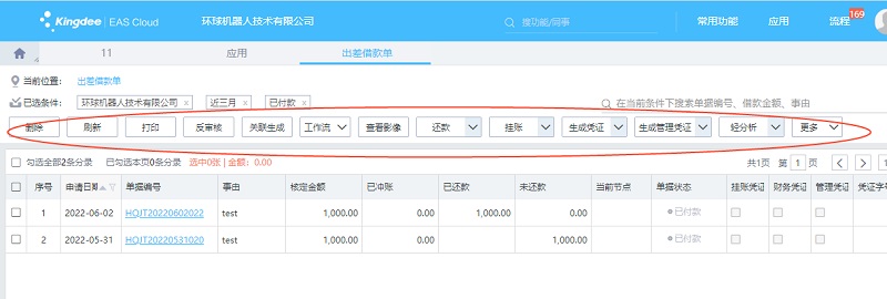 出差借款单的其它操作包括两大类,一类是在序时簿上,另一类是在单据上。