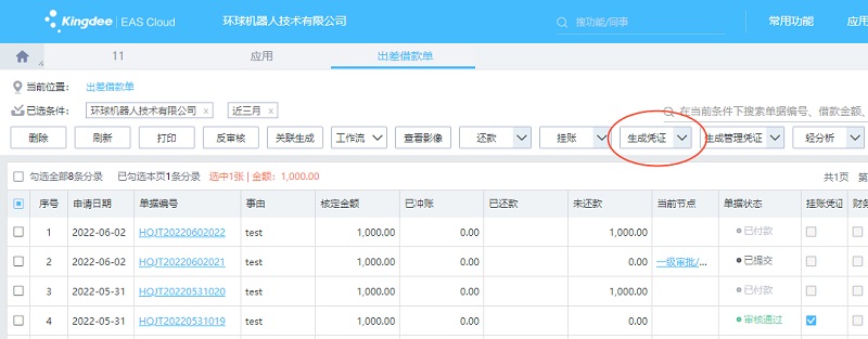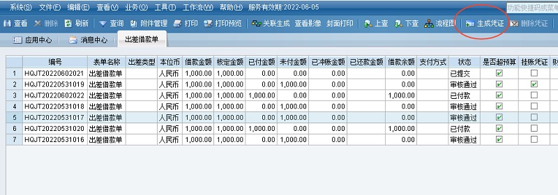CP002=是、CP008=否:“审核通过”状态的出差借款单,可以点【生成凭证】按钮生成财务凭证。