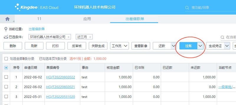 财务在EAS Cloud网页端/客户端出差借款单序时簿选中需要挂账的出差借款单,点【挂账】按钮,系统通过动态会计规则生成挂账凭证。