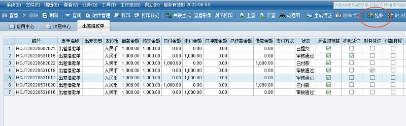 CP002=是、CP008=否:“审核通过”状态的出差借款单,可以点【挂账】按钮生成挂账凭证。