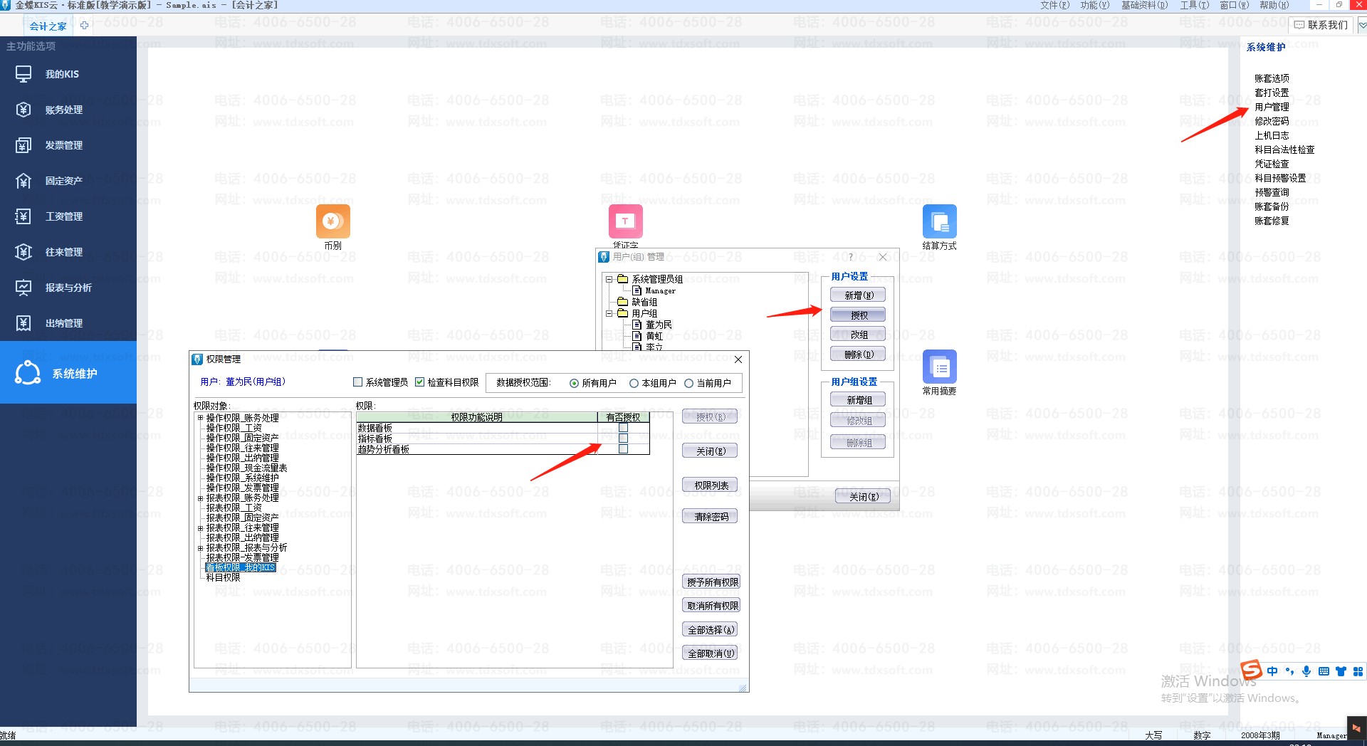 [系统维护]-[用户管理],选中用户点击[授权],找到[看板权限-我的KIS],取消勾选[指标看板]和[趋势分析看板]的权限即可。