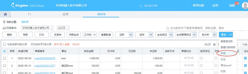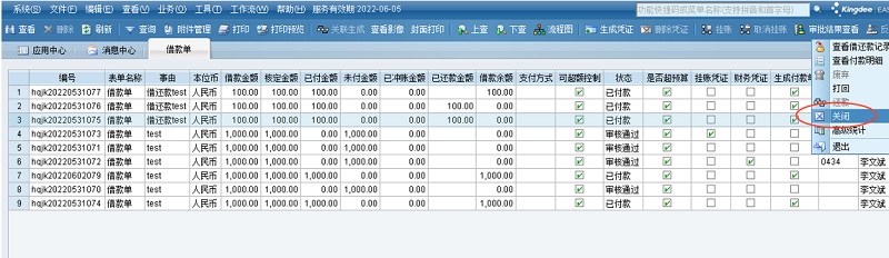 • 财务在EAS Cloud客户端借款单序时簿选中需要关闭的借款单,点【关闭】按钮,借款单是否关闭成功会有相应的提示。