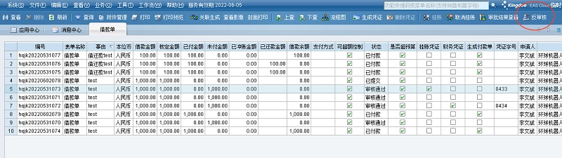 • 财务在EAS Cloud客户端借款单序时簿选中需要反审核的借款单,点【反审核】按钮,借款单是否反审核成功会有相应的提示。
