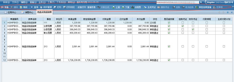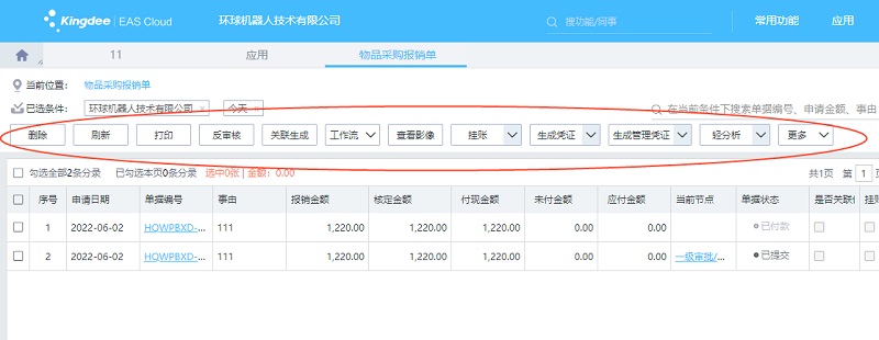物品采购报销单的其它操作包括两大类,一类是在序时簿上,另一类是在单据上。