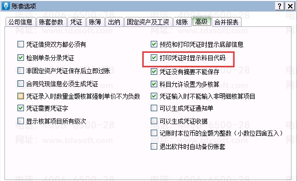打开[系统维护]-[账套选项]-[高级],勾选参数“打印凭证时显示科目代码”。