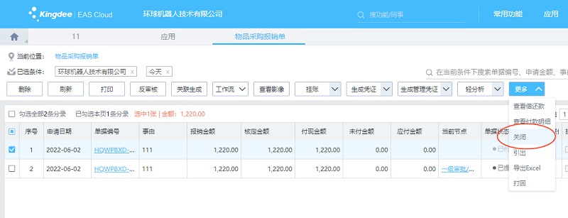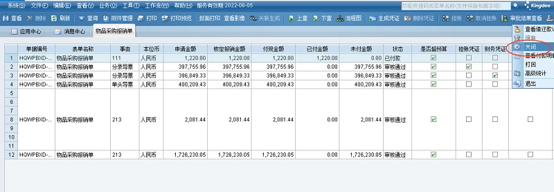 财务在EAS Cloud网页端/客户端物品采购报销单序时簿选中需要关闭的物品采购报销单,点【关闭】按钮,物品采购报销单是否关闭成功会有相应的提示。
