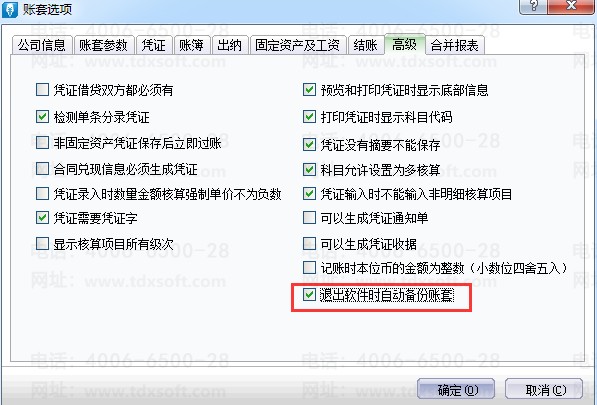 单击[功能]-[系统维护]-[账套选项]-[高级]将[退出软件时自动备份账套]参数勾上并保存。