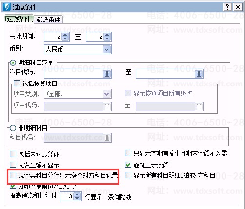 单击[账务处理]-[明细账],在过滤条件中,勾选“现金类科目分行显示多个对方科目记录”即可。