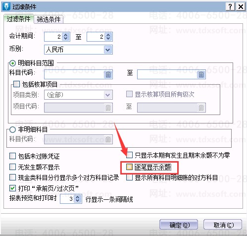 2、取消勾选“逐笔显示余额”,单击[确定]完成设置。