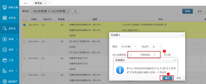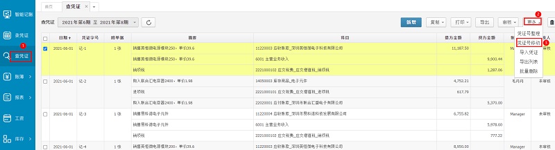 系统无法支持批量移动凭证号,可支持一张一张移动到需要的位置,具体操作:进入账簿后,点击【查凭证】点击【更多】-【凭证证号移动】在界面录入需要调整的凭证号操作即可。