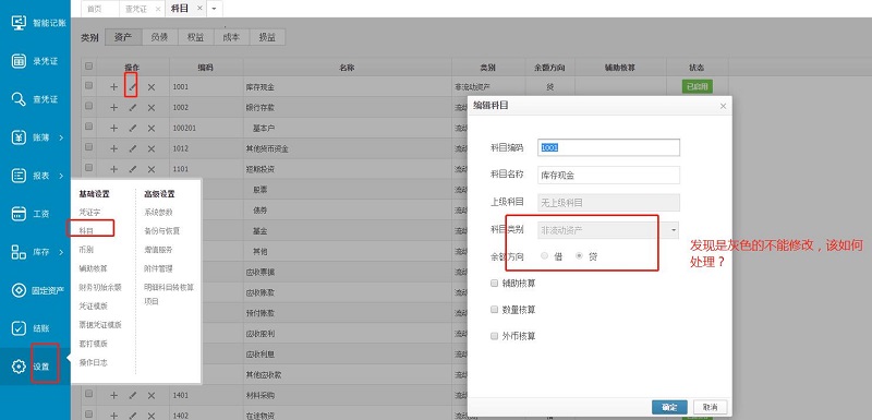 4.进账套 -- 【设置】 -- 【科目】 找到原科目“1001”,打开即可发现可以修改科目类别和余额方向(如果还不可以,也可以删除该科目后重新添加)