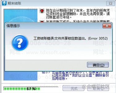 标准/迷你版年结提示报错:工资结账错误:文件共享锁定数溢出(Error 3052)。如下图所示: