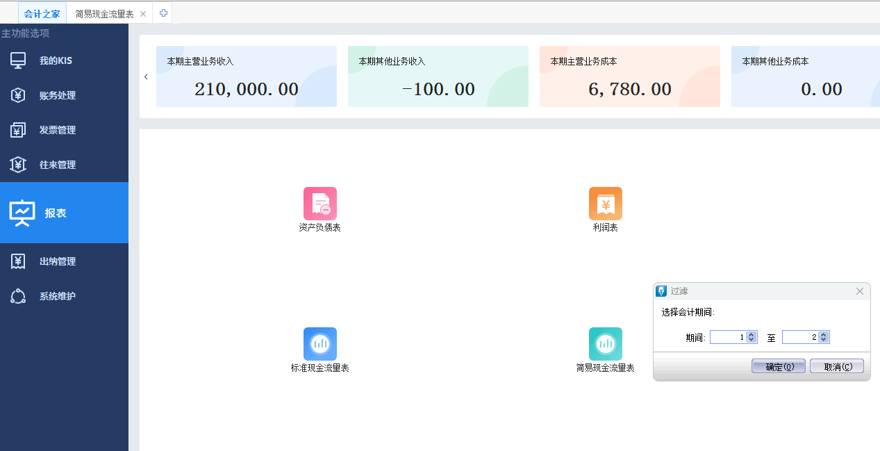 点击【报表】-【简易现金流量表】会自动跳出过滤条件选择需要查看的期间,并点击【确定】后弹出是否重新计算报表的提示,点击【是】之后则可打开对应期间报表。