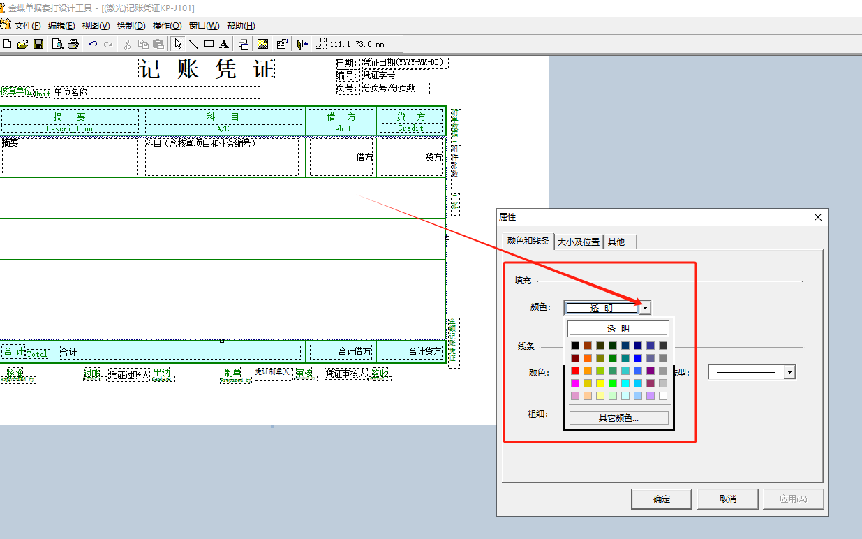 在凭证套打设置中-先单击选中分录行的表格部分-单击鼠标右键-选择【对象属性】在【颜色和线条】页签中-调整设置【填充的颜色】选项后点击确认即可,如下图所示: