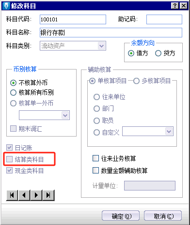 2、点击银行存款【修改】勾选结算类科目即可。