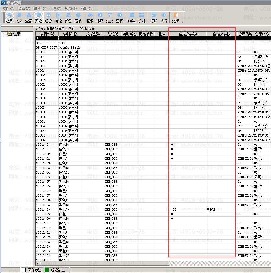 3、勾选参数“固定报表支持物料属性自定义字段的显示”的效果,在库存查询中可查看到对应的物料属性自定义字段信息,自定义字段可拖动位置