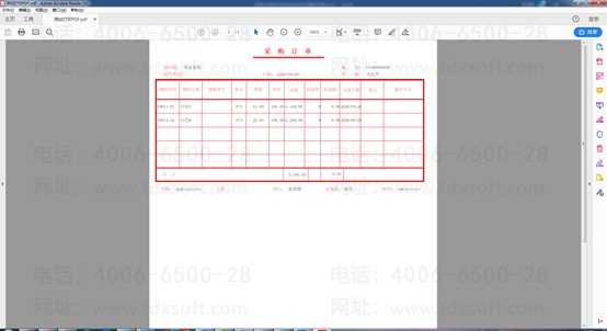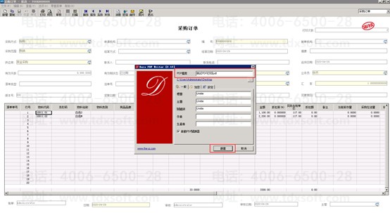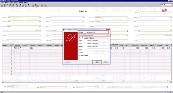 2、 打开采购订单,设置好套打模板之后,点击预览,点击打印设置,选择打印机为映射好的PDF虚拟打印机,再点击确定