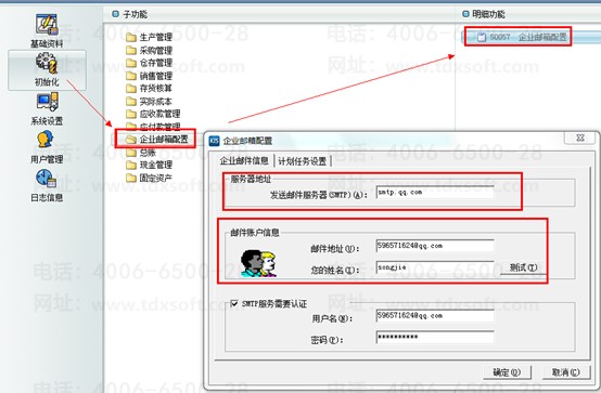 发送服务器:smtp.qq.com或者smtp.163.com电子邮件地址和邮箱账户配置自己的邮箱账套,保存后测试,既可以给配置的邮箱发送邮件,即配置成功。特别注意:这里需要输入的密码并不是登录邮箱的密码,而是开启邮箱SMTP服务的授权码。如何获取邮箱SMTP服务的授权码的授权码?下面已QQ邮箱为例