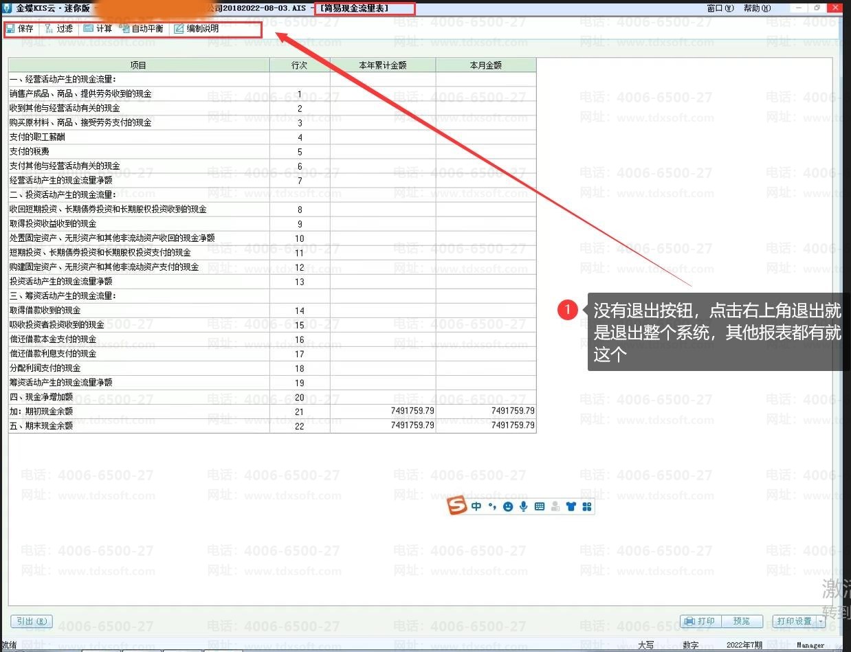KIS迷你版14.0,简易现金流量表打开没有退出按钮,之前用的是迷你版9.1,升级打开一切正常就这个报表,其他数据也正常。