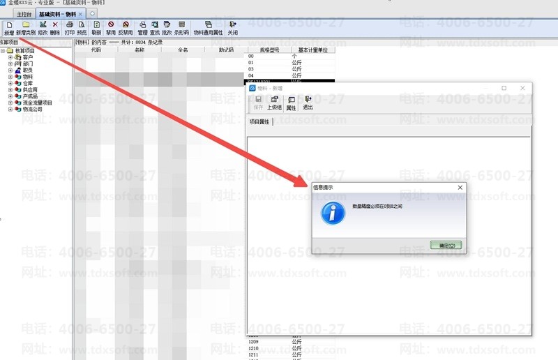 金蝶KIS云专业版16,新增物料时,弹出:数量精度必须在0到8之间