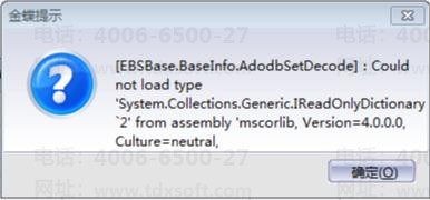使用KIS云旗舰版过程中出现如图所示的弹框提示“[(EBSBase.BaseInfo.AdodbSetDecode] : Could not load type’System.Collections.Generic.IReadOnlyDictionary 2’ from assembly 'mscorlib,Version=4.0.0.0,Culture=neutral,”
